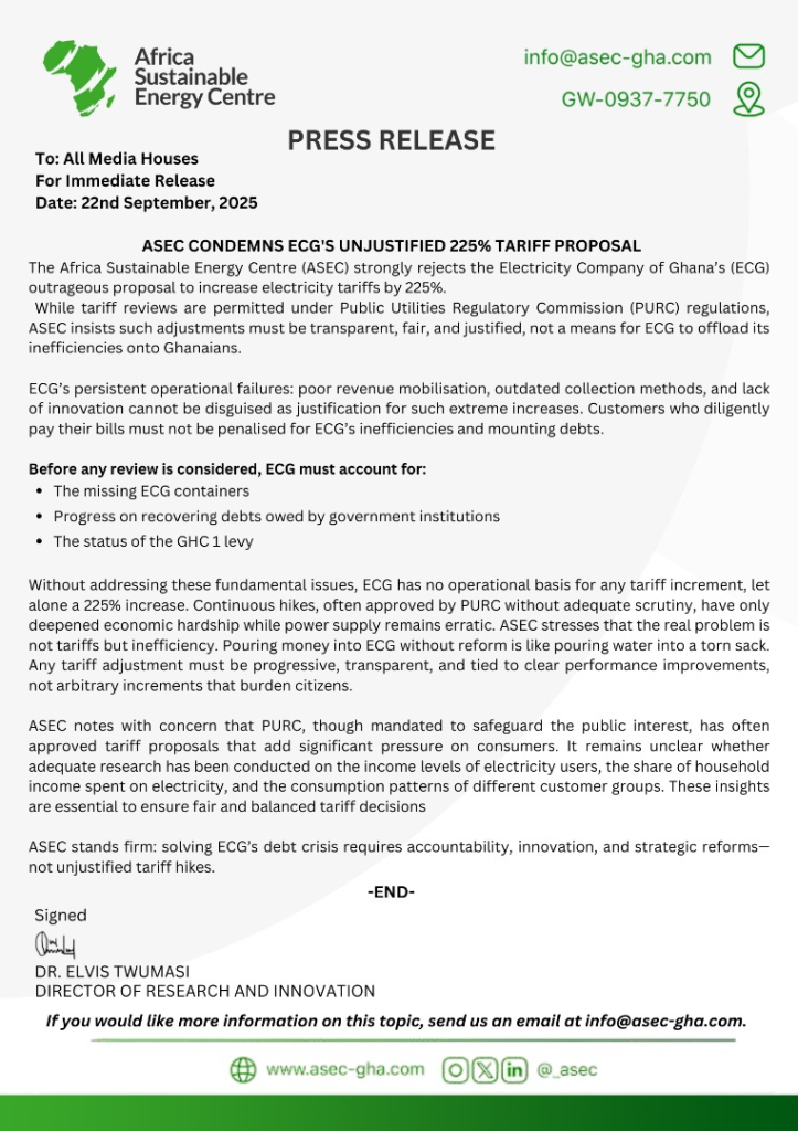 The Africa Sustainable Energy Centre ASEC has rejected the Electricity Company of Ghana (ECG’s) request to increase electricity tariffs by 225%. ASEC says before any such review is considered, the ECG must first account for its missing containers, give progress report on recovering debts of government institutions and account for the status of the GHC1 levy imposed on the cost of a litre of petrol. According to ASEC, the PURC though mandated to safeguard the public interest, has often approved tariff proposals that put significant pressure on consumers. In a Press Release signed by the Director of Research and Innovation for ASEC Dr. Elvis Twumasi, the think tank opines that solving ECG’s debt crises, requires accountability, innovation and strategic reforms and not unjustifiable tariff hikes. ASEC says ECG has no operational basis to demand increased tariffs, without addressing these fundamental issues.