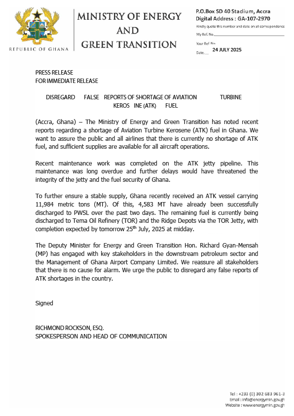 The Ministry of Energy and Green Transition has rejected claims of a shortage of aviation fuel as reported by some media outfits. A press release signed the Ministry’s spokesperson Richmond Rockson said there is no shortage of ATK and that all airline operations are going on smoothly