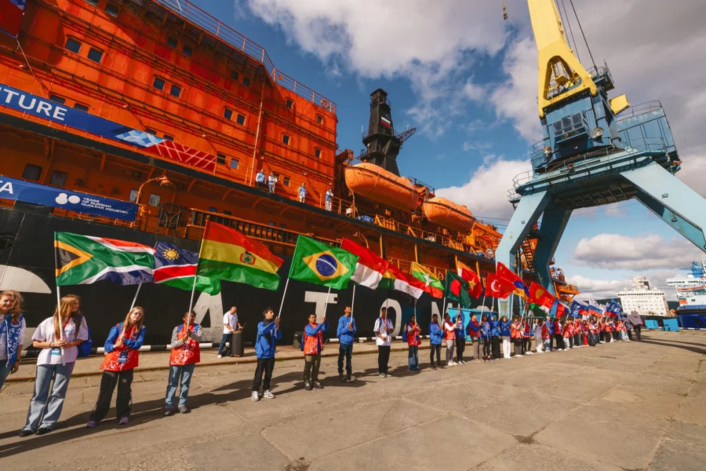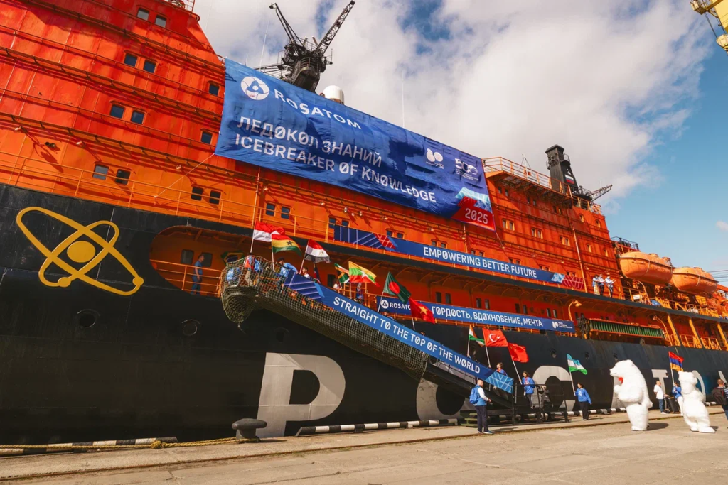 The expedition featured cultural exchanges as well. Chinese participant Alisa Li presented a three-meter-long traditional scroll depicting the 50 Let Pobedy alongside motifs symbolizing Russia-China friendship. The scroll was signed by fellow participants and the ship’s captain, Ruslan Sasov, beneath the motto of the Russian nuclear industry’s 80th anniversary: “Pride. Inspiration. Dreaming.”