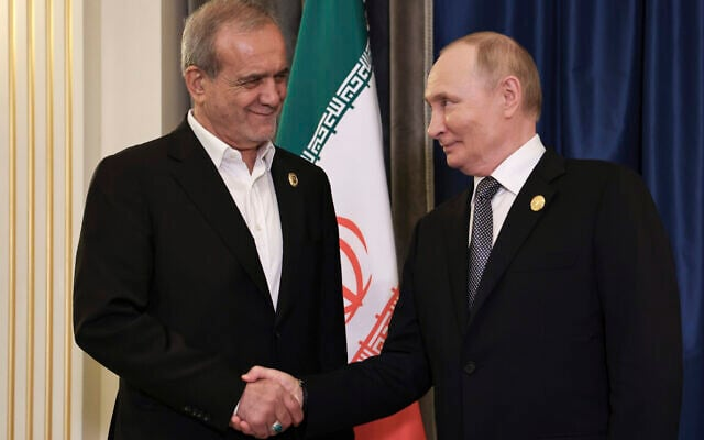 Iranian President Masoud Pezeshkian, left, and Russian President Vladimir Putin, right, shake hands during their meeting on the sidelines of the Shanghai Cooperation Organisation summit in Tianjin, China, September 1, 2025. (Alexander Kazakov, Sputnik, Kremlin Pool Photo via AP)