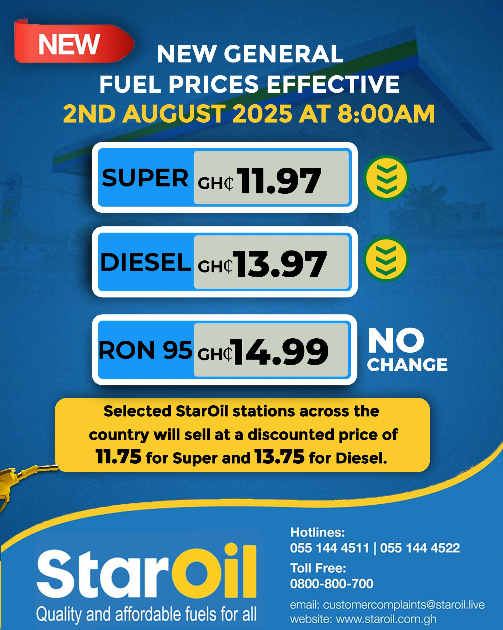 Star Oil has announced new pump prices for its petroleum products, effective 8:00 AM on Saturday August 2, 2025