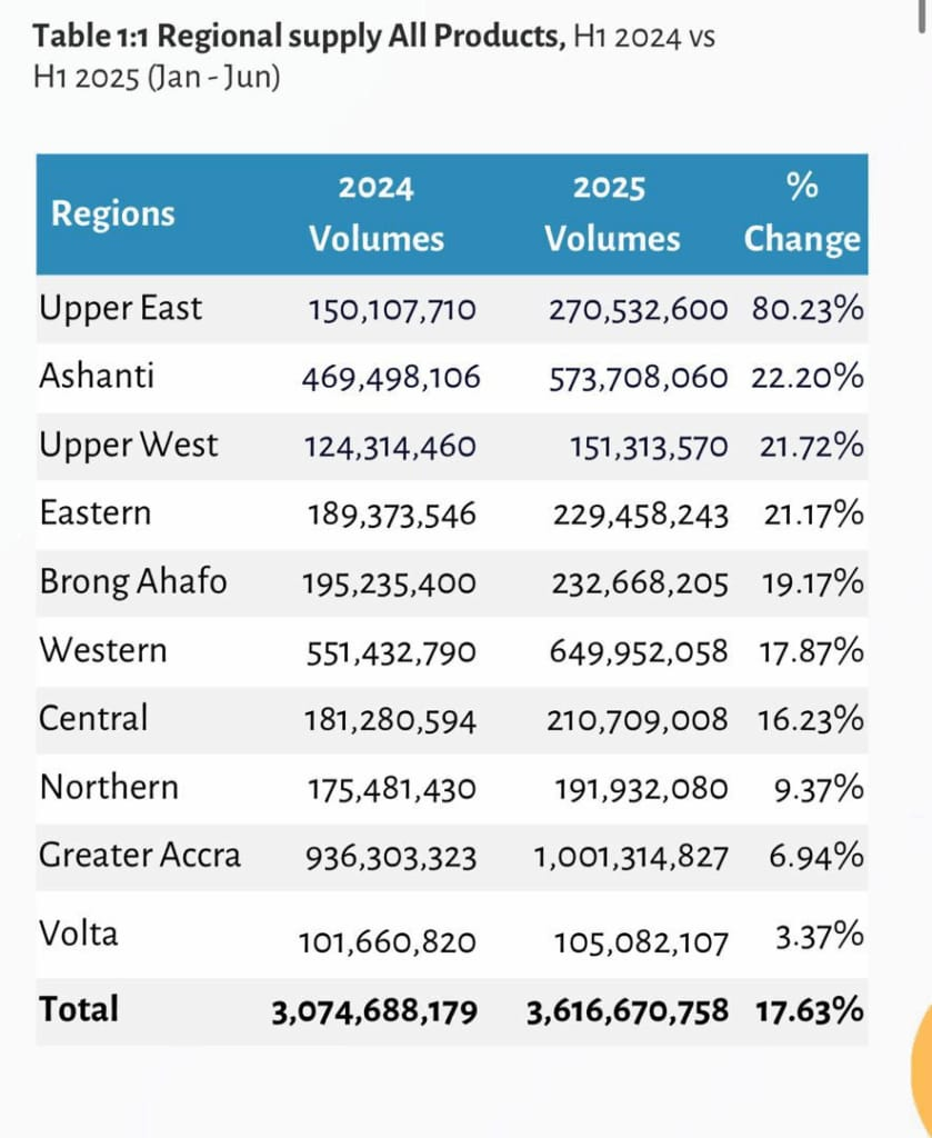 The report shows that in the first half of 2025, the Upper East Region recorded the highest growth in petroleum product consumption at 80.23%, followed by the Ashanti Region with a 22.20% increase.
