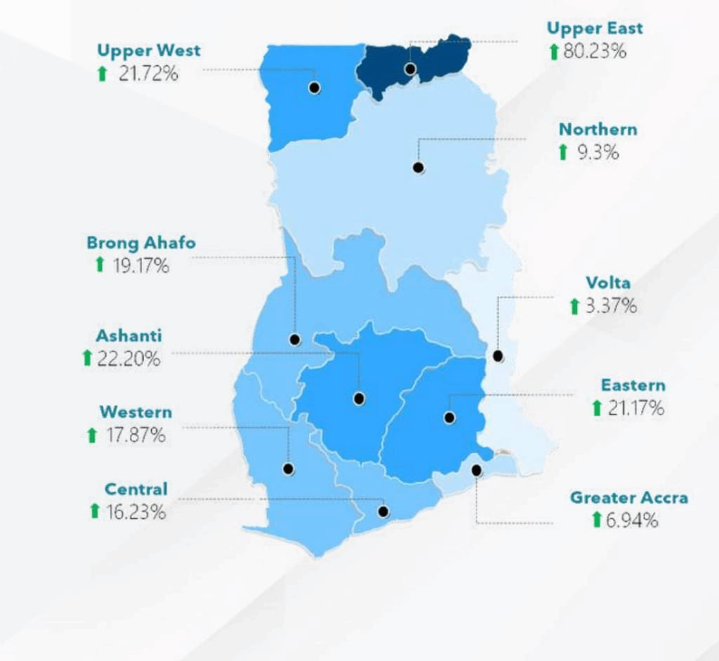 The Upper West and Eastern regions also recorded substantial gains, with no region experiencing a decline — a contrast to the 3.85% decrease recorded in the Volta Region during the same period in 2024.